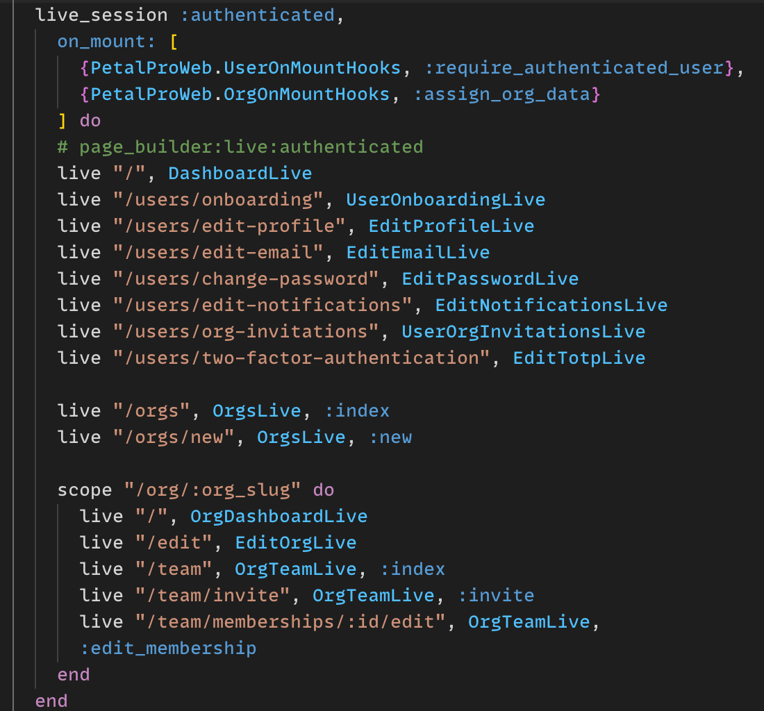 It can be tempting to create more route files like org_routes, but we found this doesn’t work well with live navigation. Every route scoped in a live_session call will be part of the same “live navigation”. This means navigating between these routes won’t cause a page refresh.