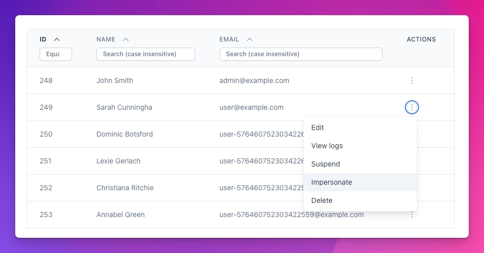 Clicking the “Impersonate” button will perform a POST request to the above route, including the user_id of the user to be impersonated. We store the current_admin_id in the session, and sign in the admin as that user.