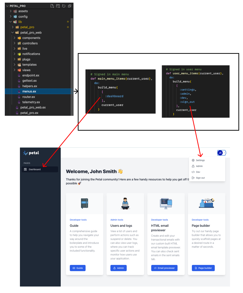 You can build menu item lists to give to layouts. We define the two core menu lists in menus.ex: