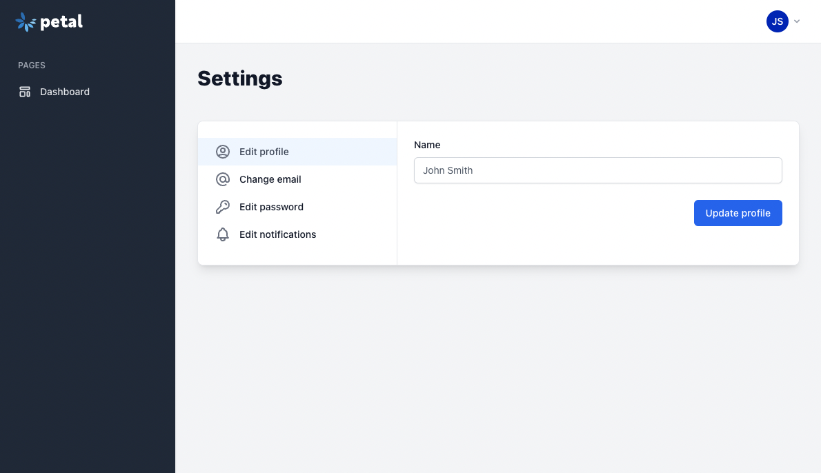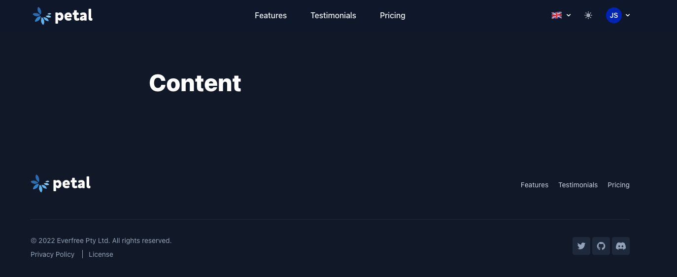 Petal Pro provides a number of layouts: “sidebar”, “stacked” and “public”. These are quite configurable however you may want to modify them. To do so, you can simply edit or duplicate the layout file in the following path: