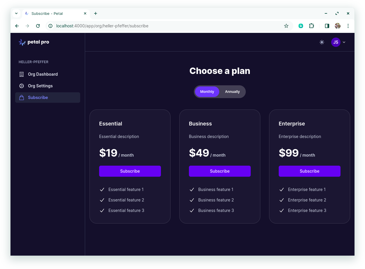 Note that the essential-monthly and essential-yearly plans contain prices that refer to Stripe (e.g. price_1NLhPDIWVkWpNCp7trePDpmi). These prices need to be replaced with Stripe Price ids that you generated.