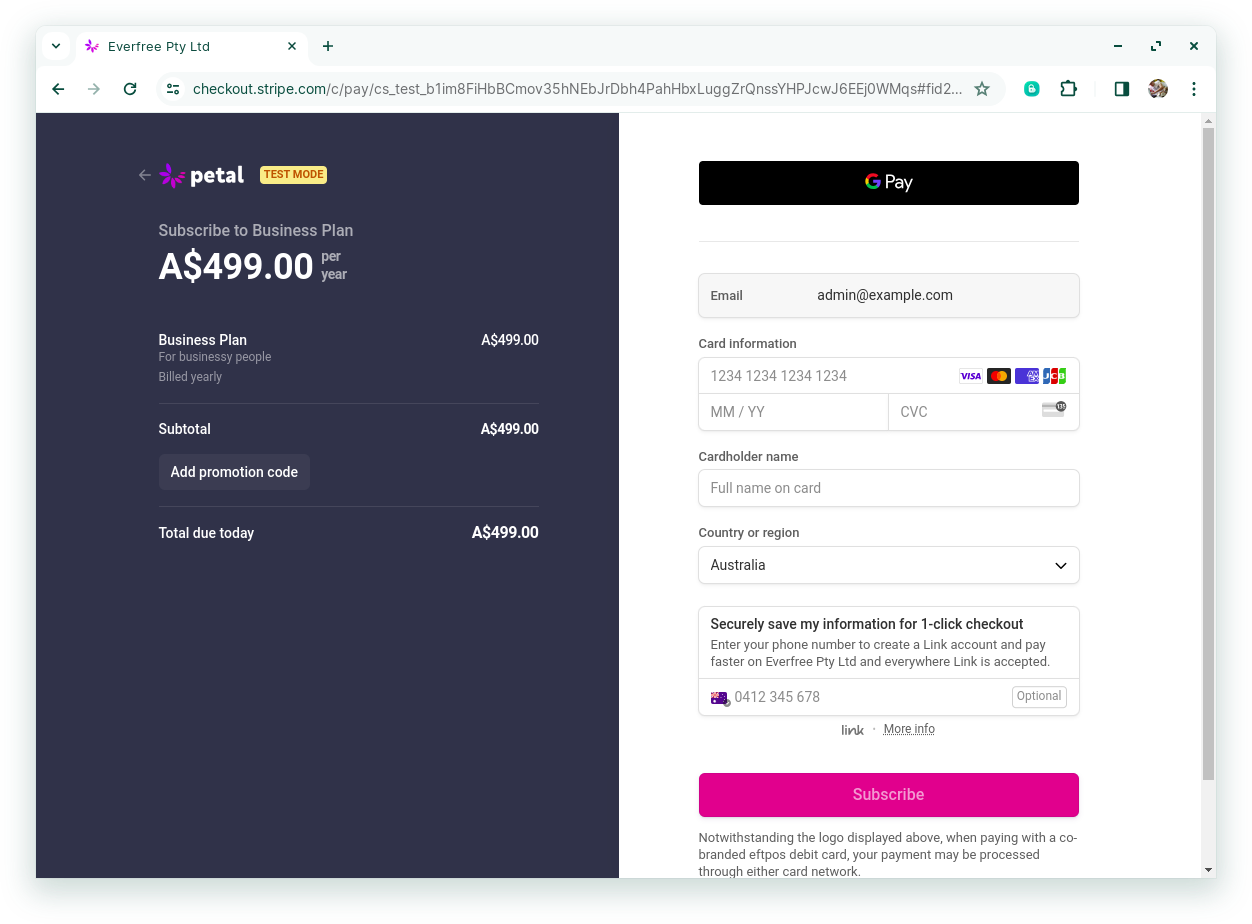 Because Stripe is in test mode, you can use the test card 4242 4242 4242 4242. Fill out the details and hit the Subscribe button.