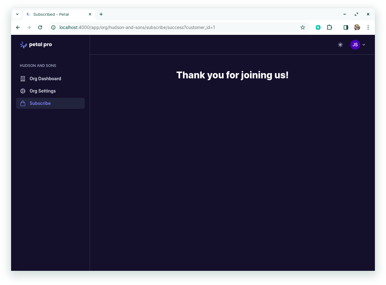 ℹ️ Information: If you see a spinner and then nothing happens, this is because the Stripe web hook listener isn't running. See [Run the CLI web hook](/petal-pro/guides/adding-a-subscription#run-the-cli-web-hook) for more information on how to set it up